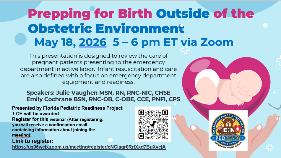 This webinar is part of the monthly Florida Pediatric Readiness series. This presentation is designed to review the care of pregnant patients presenting to the emergency department in active labor. Infant resuscitation and care are also defined with a focus on emergency department equipment and readiness. This presentation also shares the journey and collaborative approach of our pediatric and perinatal nursing education teams to improve emergency staff preparedness and perinatal outcomes in the emergency department.